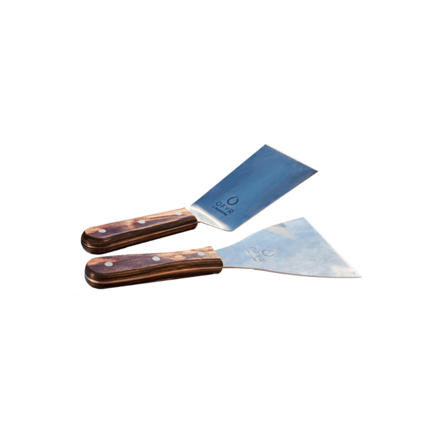 Deze set bestaat uit een burger turner en een spatel. De burger turner heeft een lang blad, waarmee vlees en groenten eenvoudig omgedraaid kunnen worden op de kookplaat. De spatel houdt kwetsbaar voedsel, zoals vis en pannenkoeken, heel met zijn brede blad.